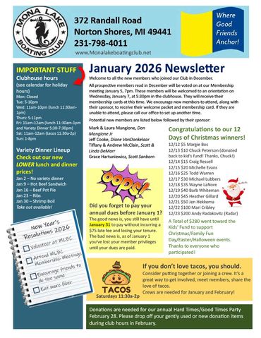 Located in the heart of Norton Shores, Mona Lake Boating Club is a private membership club. We offer 3 meals per week in our club house. Our clubhouse meals are open to the public. We offer lunch on Wednesday and Friday from 11:30am - 1:00pm. Our Friday night dinner is from 5:30pm to 7:30pm. There is a different variety dinner each week, as well as a regular menu. Come check us out.